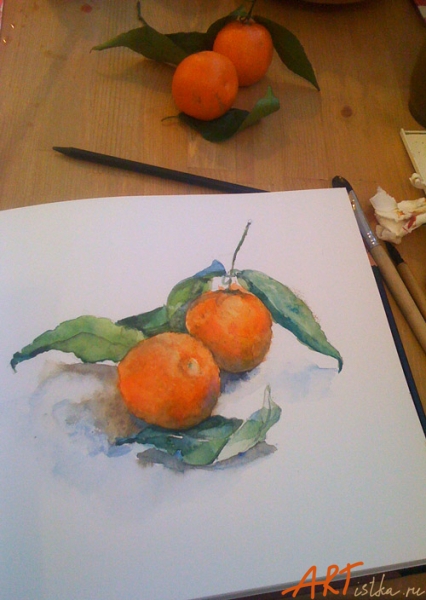 Мне сегодня в магазине попались мандарины с листиками, сами попросились ко мне в альбом. Выбирать еду для рисования - дело ответственное, дети могут съесть прям из композиции во время рисования. На завтра прикопала себе роскошный гранат, но Олежка его желает съесть уже сегодня((