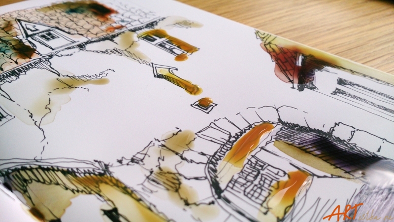 Пришлось снять салфеткой капли краски. Окрасилась очень мало, весь пигмент можно просто смыть под краном, бумагу от воды не коробит, она осталась такой же идеально гладкой, как была.