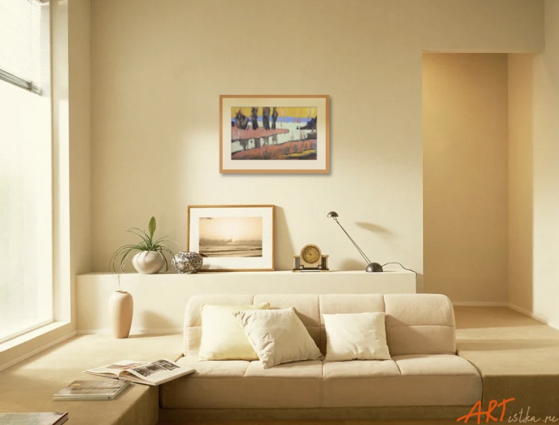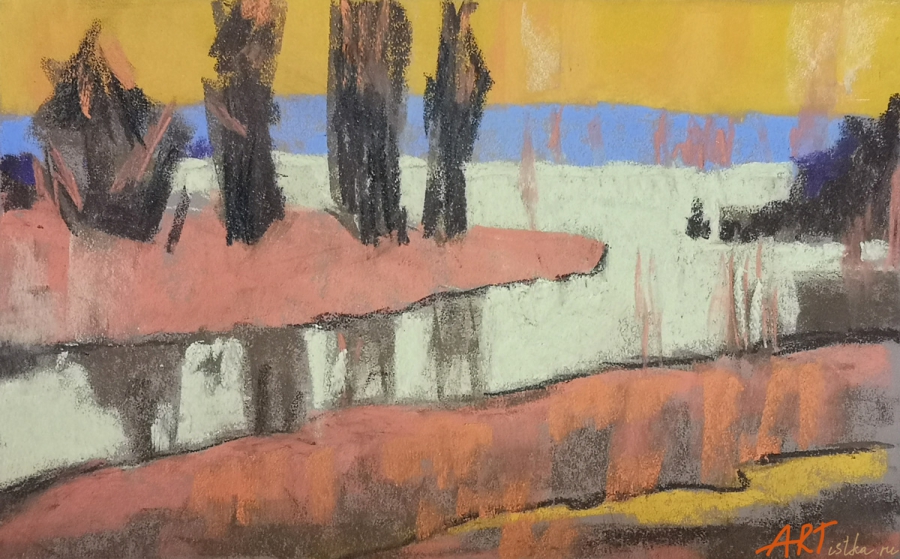 Пейзаж выполнен сухой немецкой пастелью по итальянской бумаге. Рекомендуется оформить в паспарту под стекло.