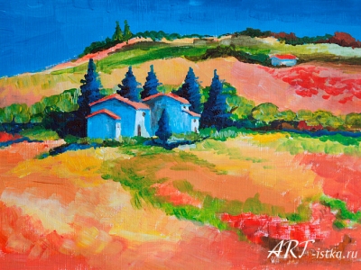 Выкладываю свои первые акриловые работы. Это были эскизы к заказу часов-картин для итальянской часовой фабрики:   Тоскана: Кипарисы: Стога: Ферма: