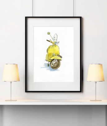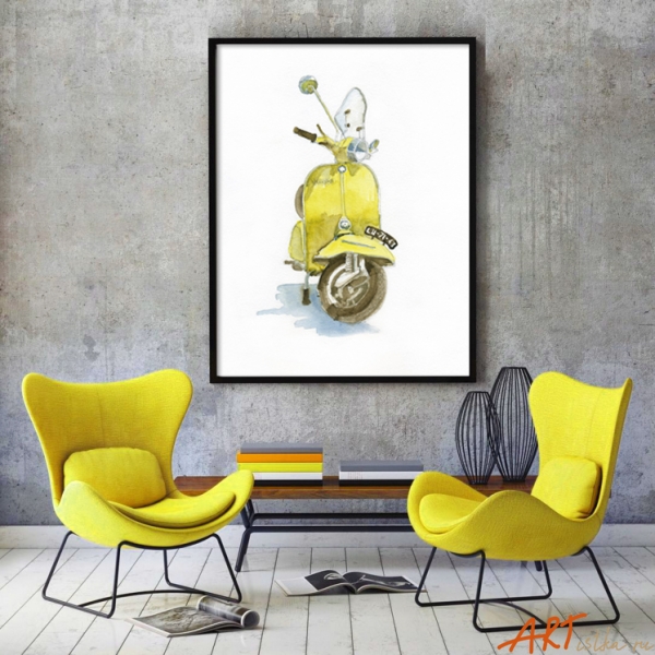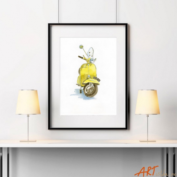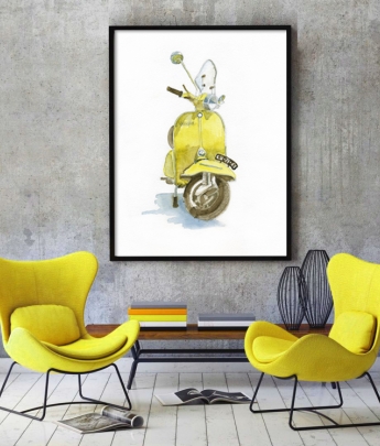 И сейчас по улицам итальянских городов жужжат скутеры Vespa. Девушки в платьях, в туфлях на каблуках, с развевающимися из под шлема волосами спешат на работу в центр Флоренции. Постер с легендарным мотороллером украсит интерьер, наполнив энергией и воспоминаниями о ваших итальянских каникулах.